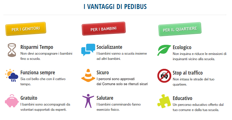 Il Pedibus è uno ‘scuolabus’ a piedi, un servizio di accompagnamento dei bambini a scuola e funziona come una vera e propria corsa di un ‘bus’: esistono linee (identificate da un colore) e rispettive fermate, contrassegnate da disegni di impronte sul marciapiede. Ogni corsa è guidata da almeno due volontari (un capofila, e uno in coda), per garantire un viaggio in sicurezza.