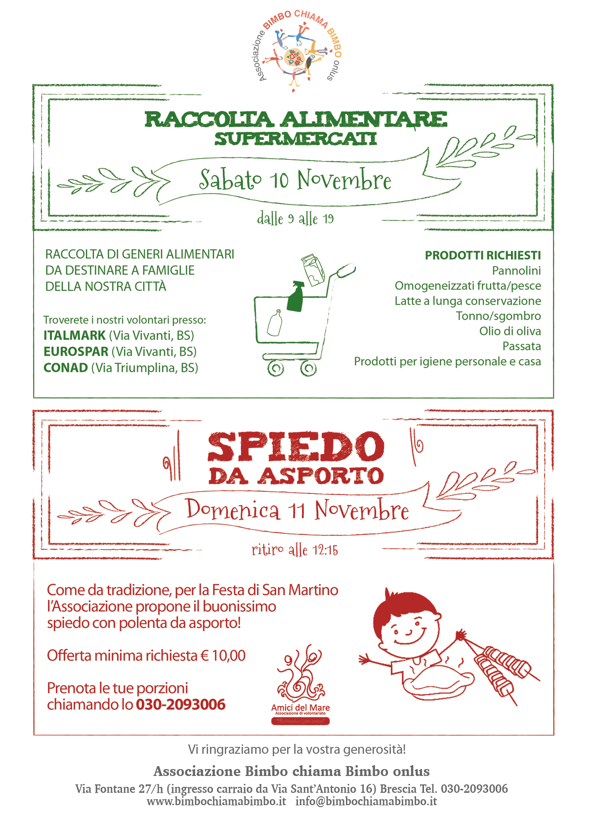 vi informiamo che Sabato 10 Novembre dalle 9 alle 19 saremo presenti presso i supermercati Eurospar e Italmark di Via Vivanti e Conad di Via Triumplina per raccogliere i prodotti necessari a rifornire il nostro Magazzino Alimentare che, come sapete, sostiene situazioni di assoluta emergenza.